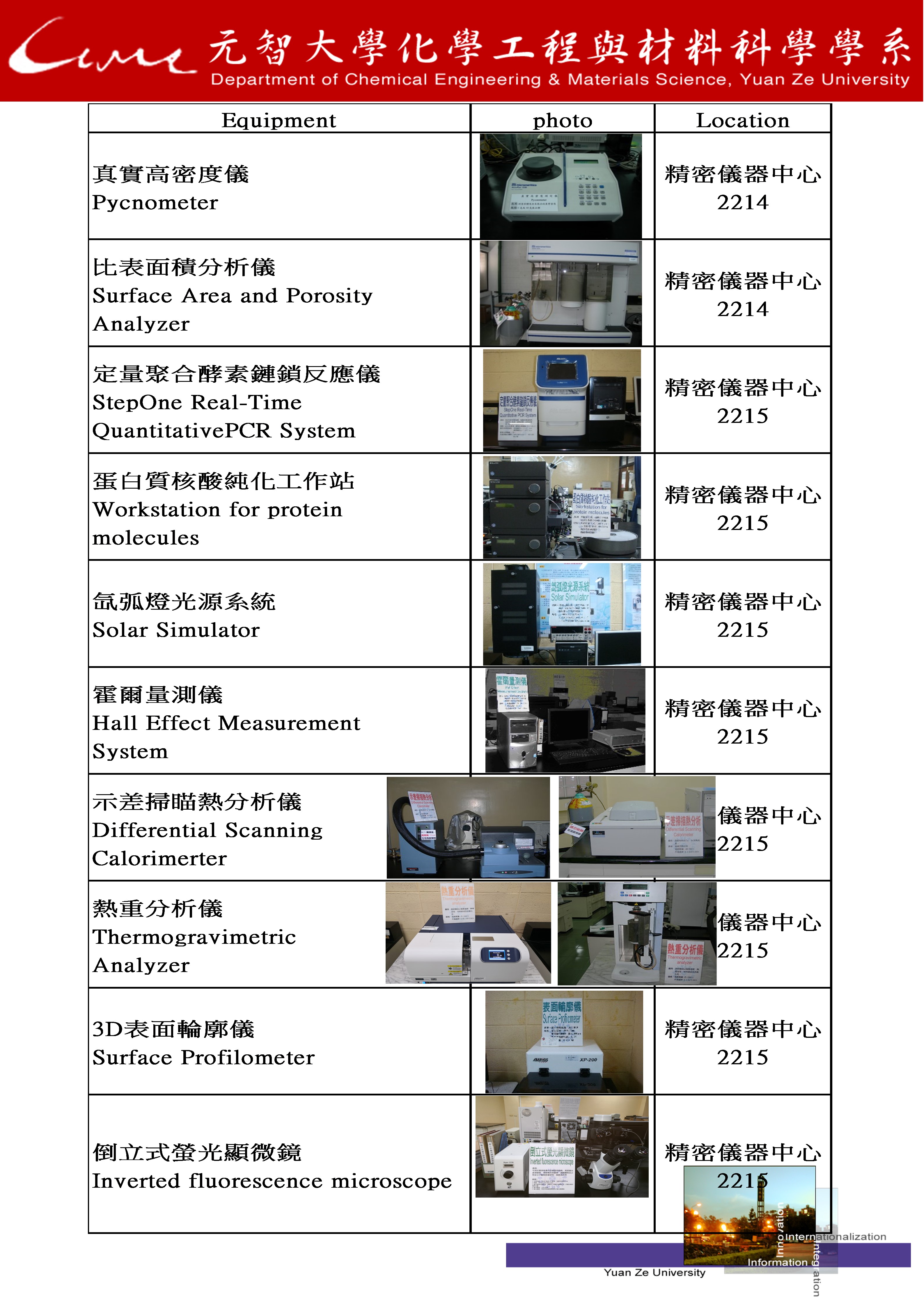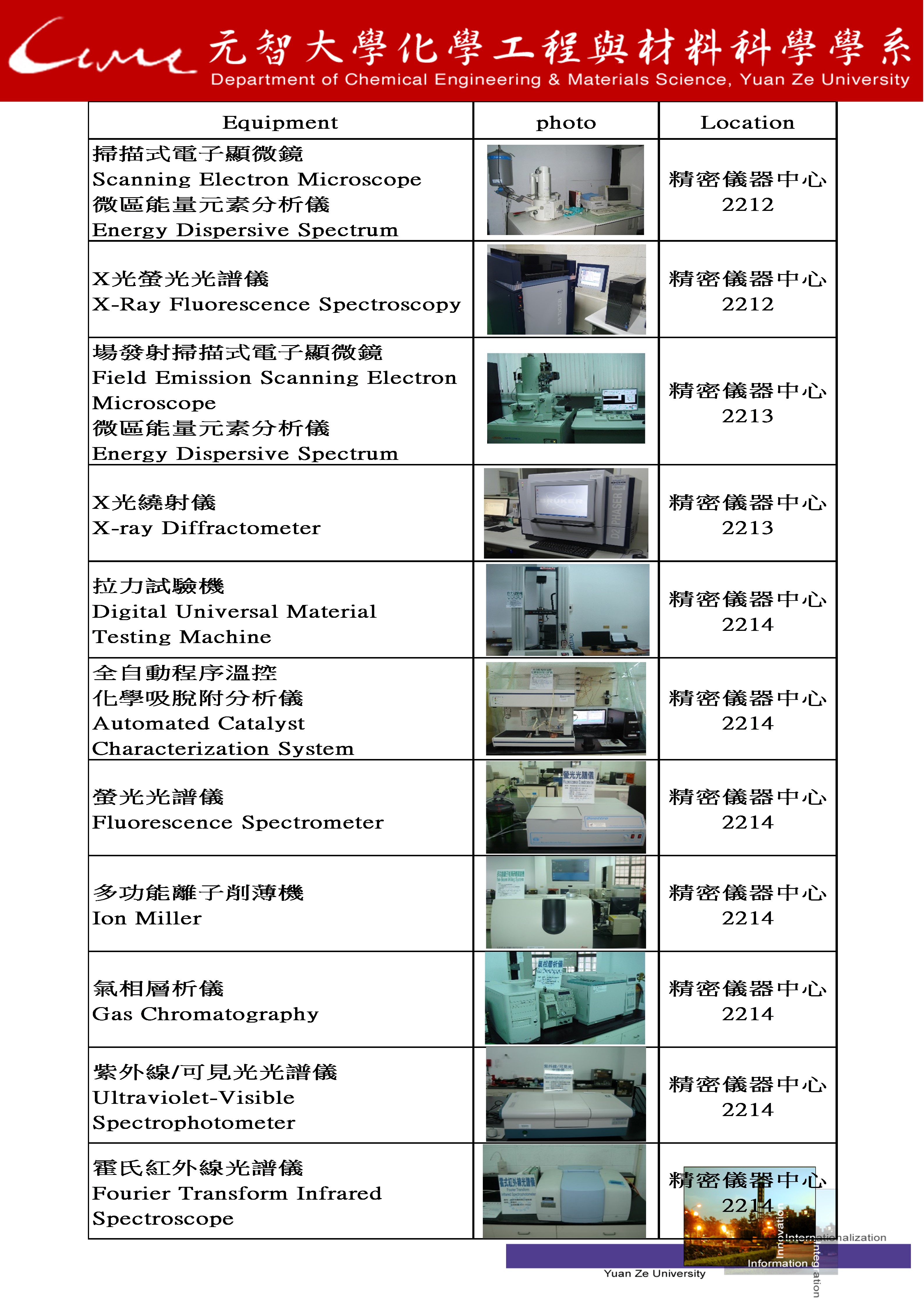 At the progression of technological trend, in order to increase the competitiveness of the Chemical Engineering and Materials Science Department, in 2000 for the expansion, covering an area of about 7200 square feet are well-equipped with sophisticated instruments, become unique instrument center at private academic institutions in Taiwan. These instruments support faculty members in the teaching and research works.