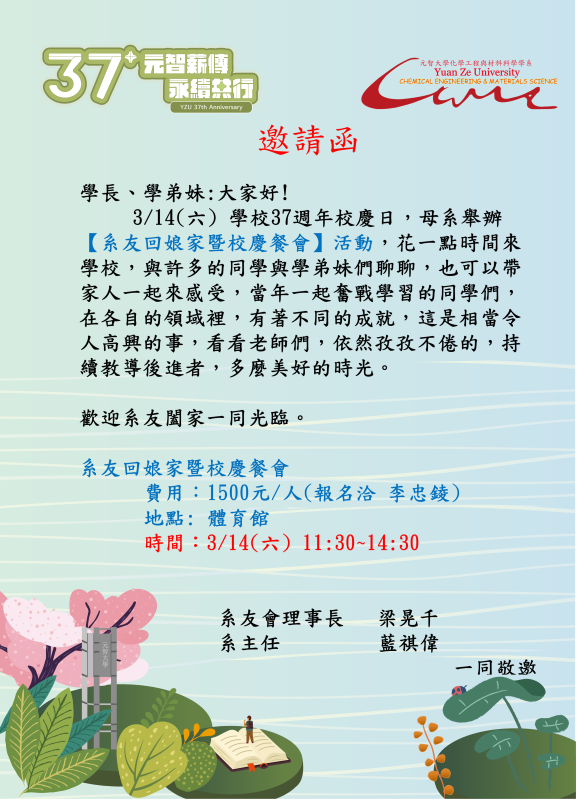 3/14(六)元智校慶【系友回娘家暨校慶餐會】活動,誠摯邀請您踴躍報名